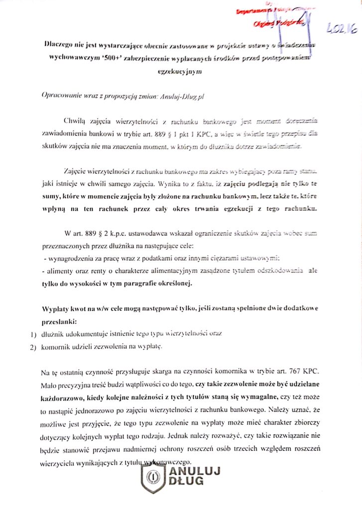 Projekt ten został zaprezentowany przez nas Minister Rafalskiej osobiście, a dokument o poniższej treści wraz z propozycją zmiany projektu sutawy został w dniu 4.02.2016 przekazany na spotkaniu przez Tomasza Parola Szefa Anuluj-Dlug.pl Olgierdowi Podgórskiemu Dyrektorowi Departamentu Polityki Rodzinnej w Ministerstwie Rodziny, Pracy i Polityki Społecznej w obecności Pana Naczelnika odpowiedzialnego za prace legislacyjne nad 500+ i ewentualne przygotowanie rządowej autoporawki. Jak się doczytacie, chodzi de facto o dodanie do ustawy jednego zdania: